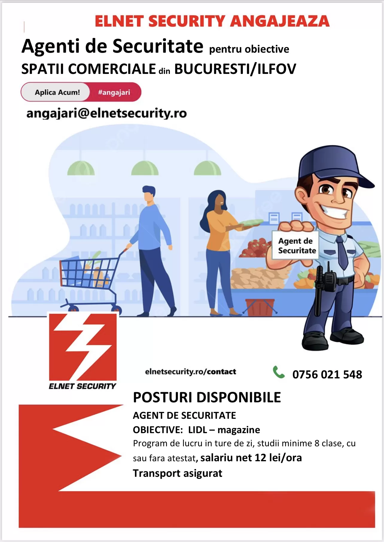 Agenți de Securitate Firma de paza Elnet Security angajează personal, bărbați și femei pentru urmatoarele obiective SPAȚII COMERCIALE din BUCURESTI / ILFOV.