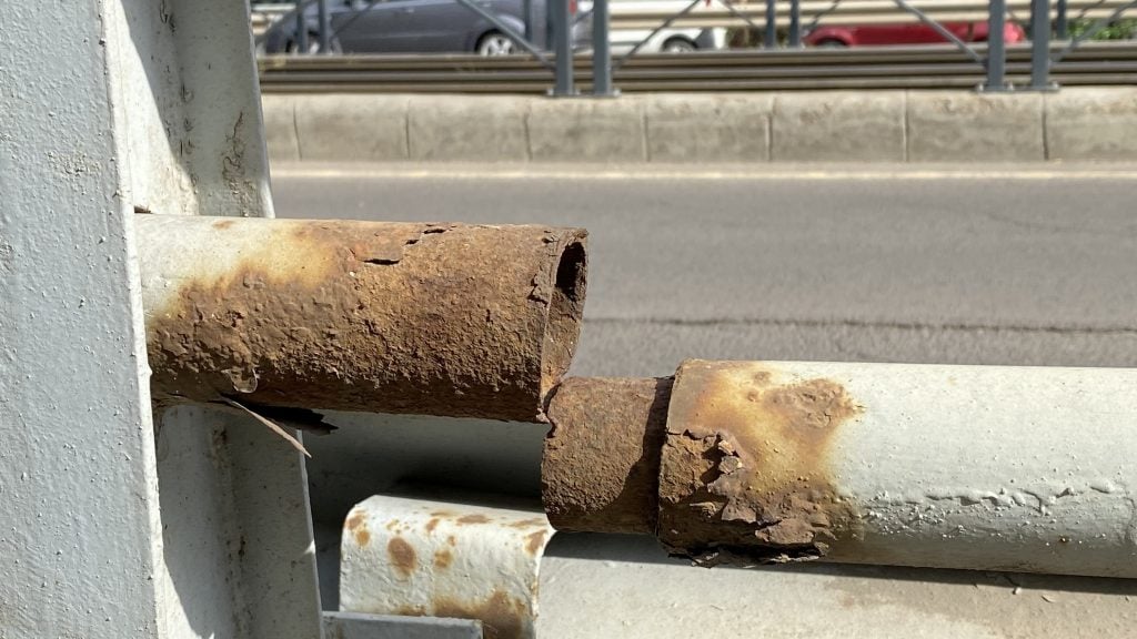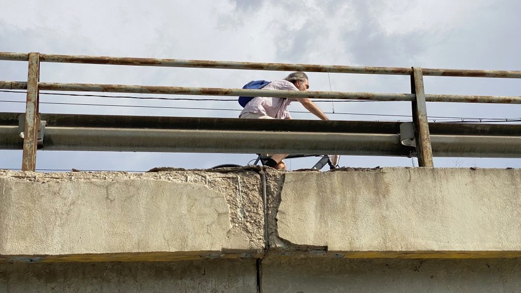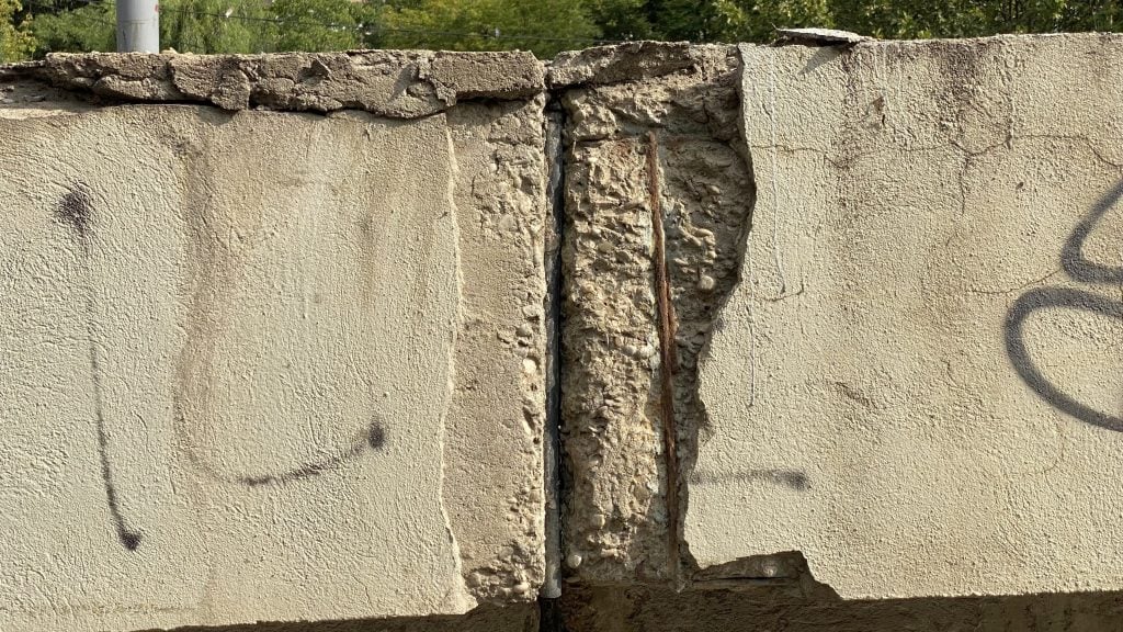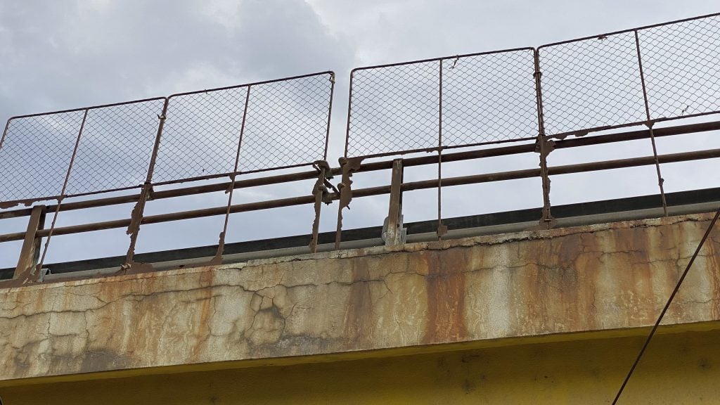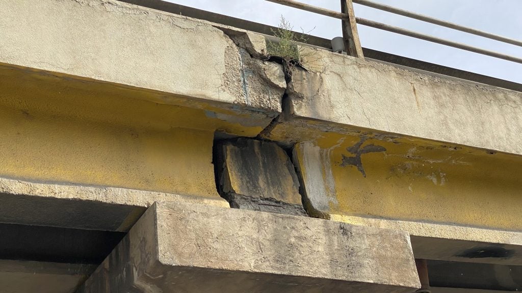 Bucăți întregi de beton sunt desprinse, asfaltul este denivelat, tencuiala stâlpilor de susținere este căzută, indicatoarele rutiere sunt ruginite de ani, balustradele din metal sunt rupe, iar unele zone sunt însemnate cu bandă pentru a atrage atenția în ceea ce privește pericolul.