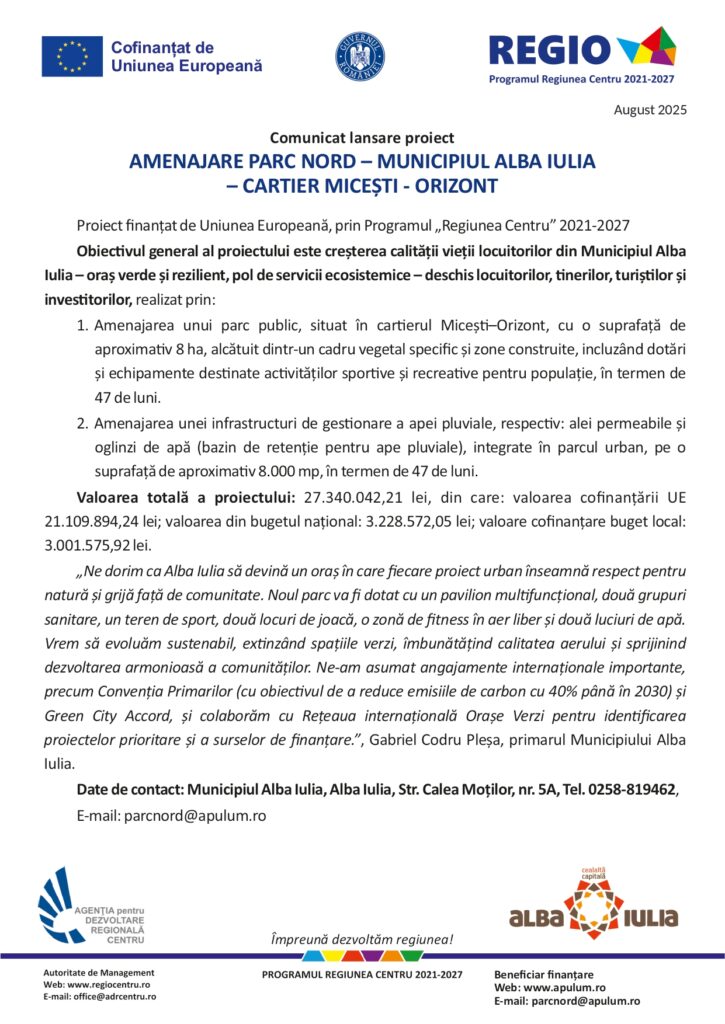 Comunicat lansare proiect AMENAJARE PARC NORD – MUNICIPIUL ALBA IULIA – CARTIER MICEȘTI – ORIZONT ActualitateComunicat lansare proiect AMENAJARE PARC NORD – MUNICIPIUL ALBA IULIA – CARTIER MICEȘTI – ORIZONT FacebookTwitterPinterestWhatsApp De: GDB august 13, 2025 Vezi si alte articole... Terapeuții din București dau verdictul: Tot mai multe persoane, preocupate de sănătatea mintală decembrie 8, 2025 Ministerul Educației reglementează temele pentru acasă; ministrul spune că este doar unul dintre paşii spre o educaţie mai bună decembrie 8, 2025 Educația se bazează pe Allied Telesis pentru mediile de învățare decembrie 8, 2025 FacebookTwitterPinterestWhatsApp