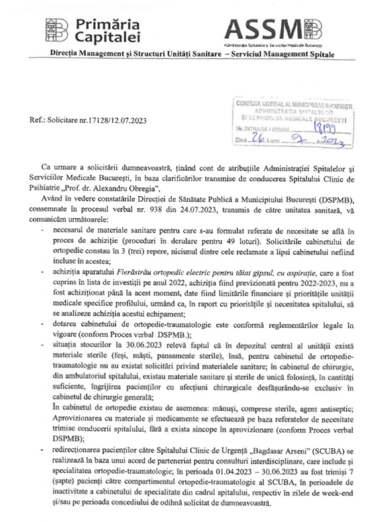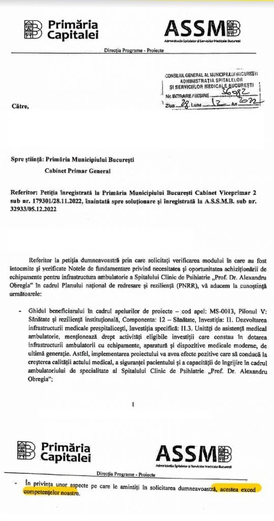 Medicul de la „Obregia” a transmis către ASSMB o petiție prin care anunță că retrage notele de fundamentare și își exprimă suspiciunea de fraudă, însă răspunsul Administrației Spitalelor a fost: „aspectele exced competențelor noastre”, se arată în adresa semnată de actualul adjunct, pe atunci director, Cristian Plută.