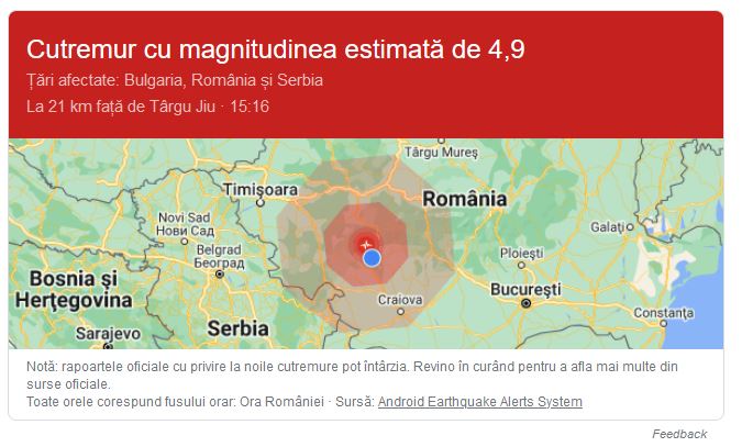 Cutremurul a fost resimțit puternic. Serviciul oferit de Google plasează seismul la o adâncime de doar 10 km.