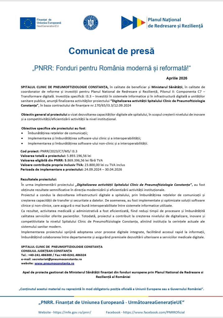 Digitalizarea activității Spitalului Clinic de Pneumoftiziologie Constanța ActualitateDigitalizarea activității Spitalului Clinic de Pneumoftiziologie Constanța FacebookTwitterPinterestWhatsApp De: GDB aprilie 18, 2026 Vezi si alte articole... Mai contează cultura în ziua de azi? întreabă Fundația9 I BRD la 10 ani de la înființare aprilie 18, 2026 Unde poți face un consult ortopedic în Cluj: soluții la Centrokinetic aprilie 18, 2026 Moscova amenință direct patru țări NATO. „Dreptul inerent la autoapărare” aprilie 18, 2026 FacebookTwitterPinterestWhatsApp