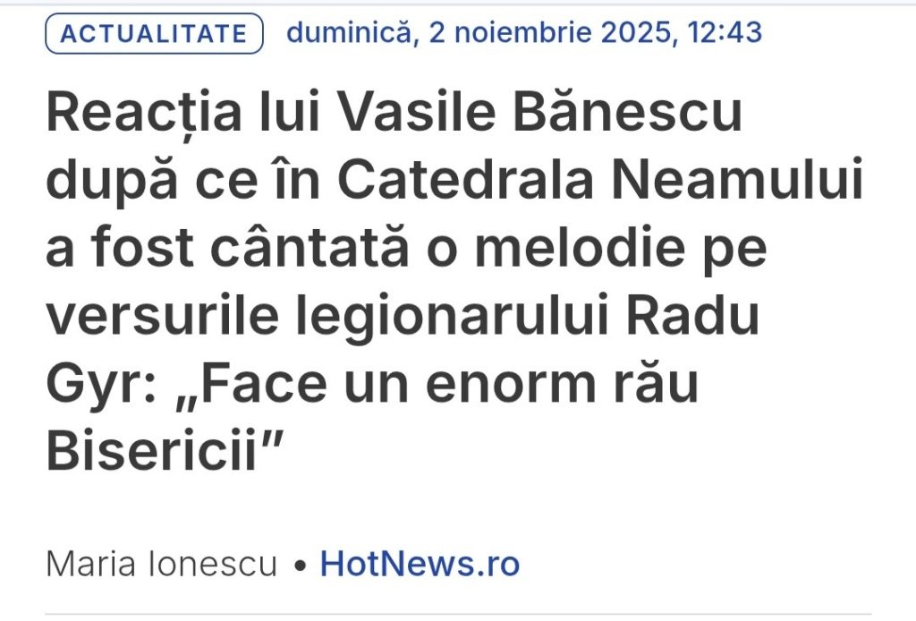 Informația a fost făcută publică de Patriarhia Română, după ce unii au acuzat faptul că la noul lăcaș al Bisericii ar fi cântat „muzică legionară”, pe motiv că versurile melodiei respective i-ar fi aparținut poetului Radu Gyr, fost membru al Mișcării Legionare.