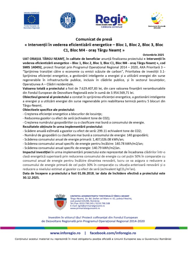Intervenții în vederea eficientizării energetice – Bloc 1, Bloc 2, Bloc 3, Bloc C1, Bloc M4 – oraș Târgu Neamț ActualitateIntervenții în vederea eficientizării energetice – Bloc 1, Bloc 2, Bloc 3, Bloc C1, Bloc M4 – oraș Târgu Neamț FacebookTwitterPinterestWhatsApp De: GDB octombrie 28, 2025 Vezi si alte articole... Înscrierile în ‘Matematică Remedial’ sunt deschise până pe data de 31 octombrie octombrie 28, 2025 Redmi Pad 2: tableta perfectă pentru elevi și profesori în 2025 octombrie 28, 2025 Primăria lui De Mezzo montează un lift care se oprește la etajul cinci, deși clădirea are șase etaje octombrie 28, 2025 FacebookTwitterPinterestWhatsApp