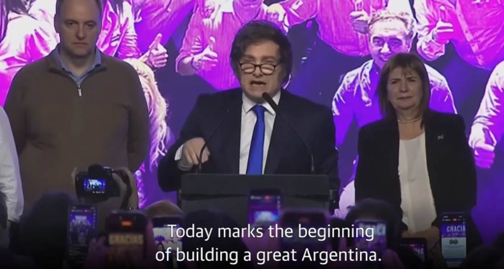 „Poporul argentinian a decis să lase în urmă 100 de ani de decadență”, a spus Milei în timp ce susținătorii săi aclamau. Președintele s-a referit la o succesiune de guverne peroniste care au dus Argentina în spirale inflaționiste și incapacitatea de plată a datoriei suverane.