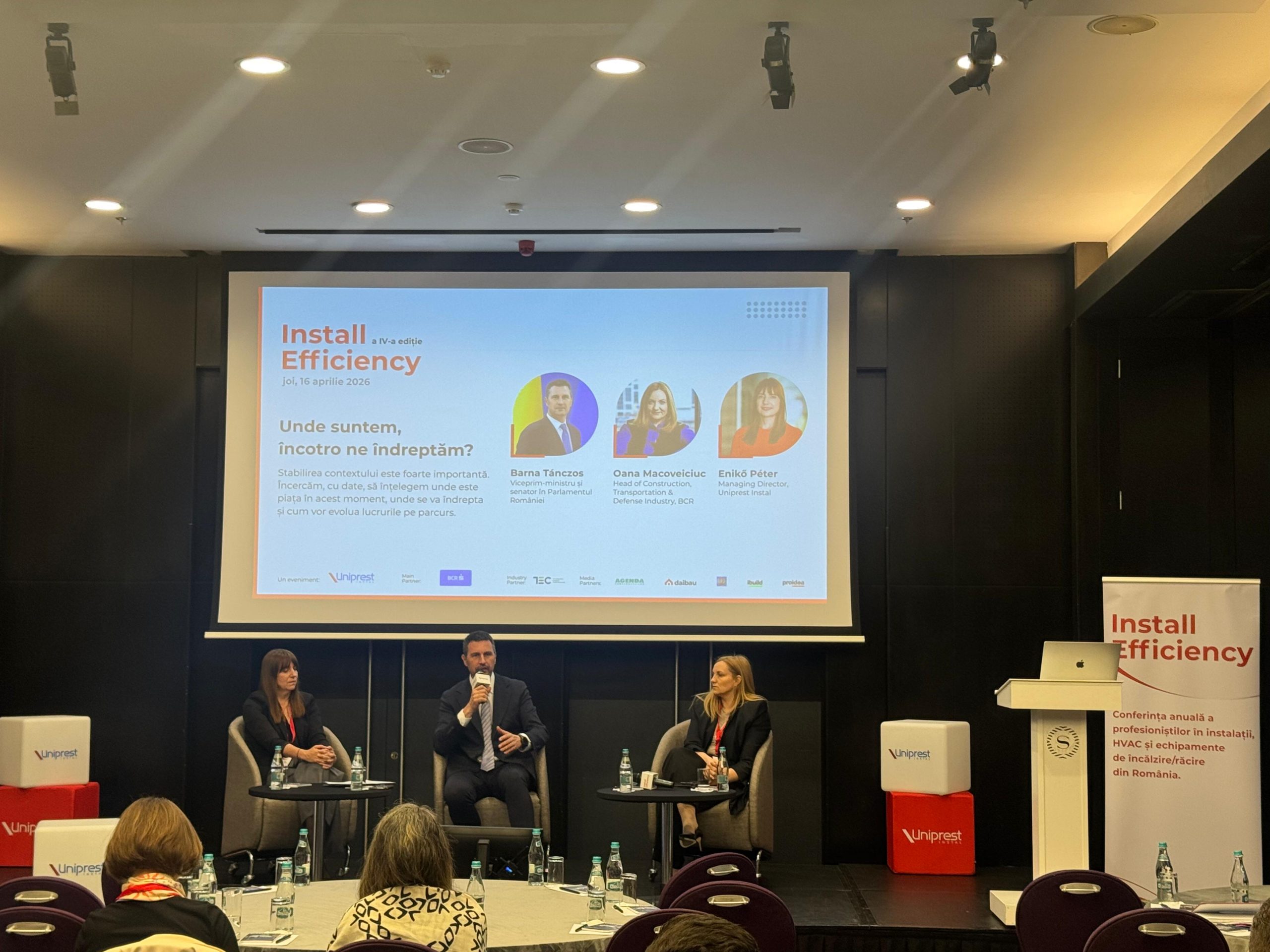„În contextul actual, rolul statului este esențial în susținerea sectoarelor afectate de incertitudine și de scăderea investițiilor. Domeniul construcțiilor și instalațiilor este unul cu reacție lentă, unde deciziile luate astăzi se văd în piață peste luni sau chiar ani, motiv pentru care este nevoie de planificare pe termen mediu și lung. În același timp, fondurile europene rămân principalul motor de dezvoltare, iar prioritatea noastră este finalizarea proiectelor aflate în derulare și creșterea capacității de absorbție. România are în continuare un potențial semnificativ de creștere, însă pentru a-l valorifica este nevoie de investiții coerente, de consolidarea capacității industriale și de o utilizare eficientă a resurselor disponibile.”, afirmă Barna Tánczos, Viceprim-ministru și senator în Parlamentul României, în cadrul conferinței Install Efficiency 2026.