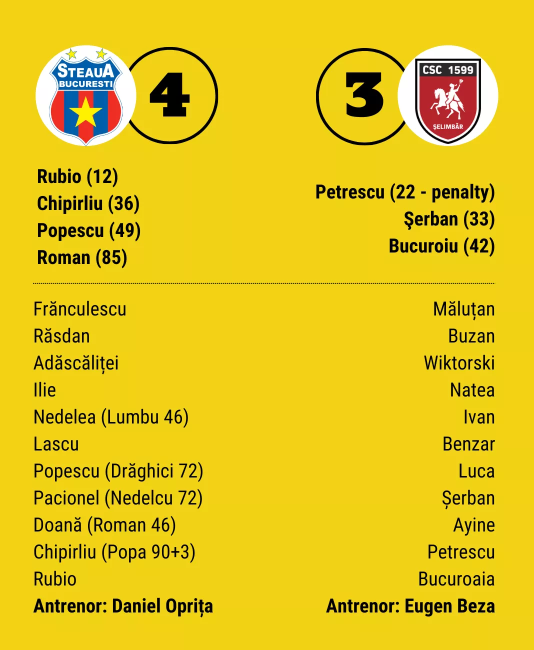 Steaua și CSC Șelimbăr s-au duelat în etapa cu numărul 10 din Liga 2, pe stadionul din bulevardul Ghencea. A fost un meci spectaculos, cu răsturnări de scor și un final clasic, roș-albaștrii reușind să întoarcă scorul și să câștige după ce au fost conduși.